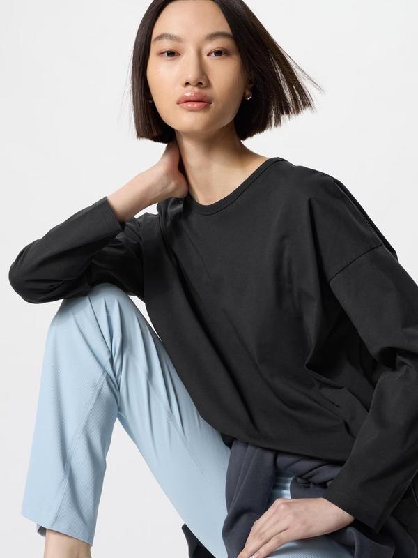 Склад: 70% бавовна, 30% поліестер AIRism Cotton T-Shirt | Long Sleeve гладка тканина «AIRism» з ефектом бавовни з технологією швидкого висихання DRY універсальна горловина, футболка з довгим рукавом помірно розслаблений силует з подовженим ззаду подолом підходить для повсякденного або вишуканого стилю добре поєднується з брюками та спідницями крій оверсайз