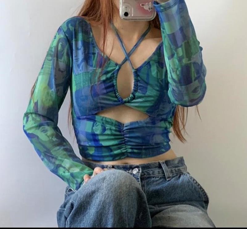 Стильний лонгслів PRIMARK М на зав'язці з абстрактним принтом блакитний із зеленим сітчастий Бренд PRIMARK Розмір М. Довжина 42 см. Довжина рукава 60 см. По грудях 42-44 (регулюється затяжкою), по талії 36-40 см. Плечі по спинці 36 см Состав 95% полиэстер 5% эластан. Тканина еластична сітчаста, напівпрозора. Принт абстрактний, газета. У стилі y2k Без нюансів Бренд-бірки на фото