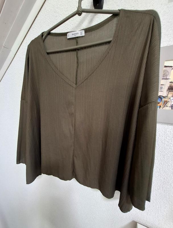 Легкий, рукава укороченные. Фасон - снизу расширен. Бирка со составом срезанная, состав не помнит, но напоминает добавление вискозы - ткань легкая, мягкая, не мнется. Рукав от плечевого шва 27 см (шов спущен), от горловины 53 см. Ширина по низу 83 см, полуобхват груди 61 см. Длина 53 см. Размер М. Цвет приятный, хаки. Повреждения нет.