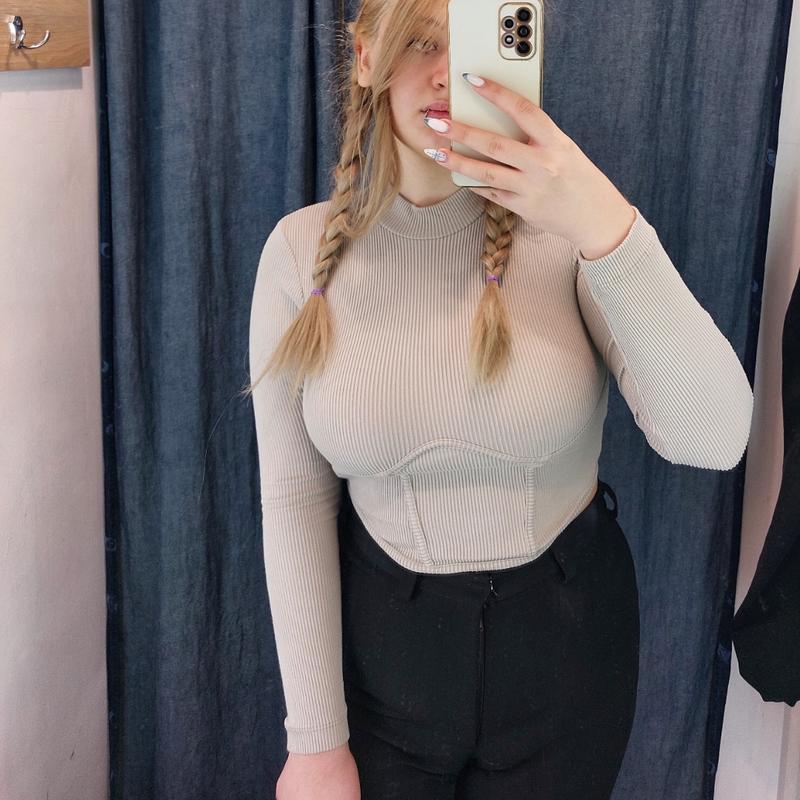 Матеріал в рубчик, на 2му фото краще видно. Має акцент під грудьми, розмір Л, але або на менші груди (1-2 розмір), або на М гарно підійде.