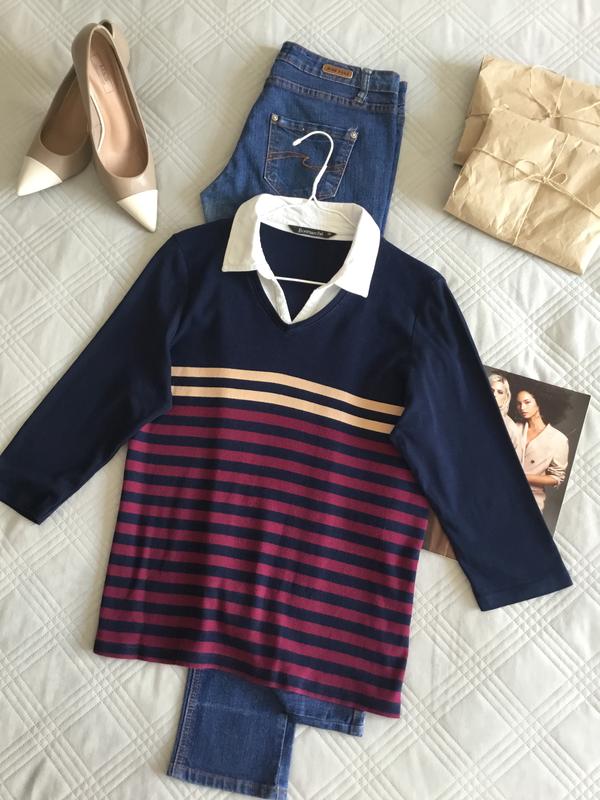 Стильный трикотажный поло Замеры🍓 Длина 64 см Бюст 54 см По линии бедра 53 см В районе талии 47 см Плечи 40 см Рукав 45 см Состав 100% хлопок