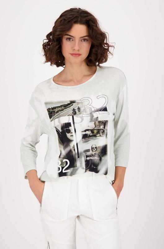 Лонгслів від Monari в стилі сиарт-кежуал зі стильним принтом коллаж на грудях, прикрашений стразами рукав три чверті та круглий виріз легко комбінується з іншими речами гардеробу стане чудовим доповненням до будь-якого образу