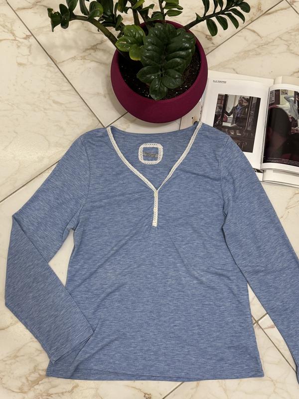 Жіноча нічна сорочка-лонгслів блакитного кольору з мереживом у розмірі L. Стан - ідеальний. Склад: 62% поліестер, 33% віскоза, 5% еластан.