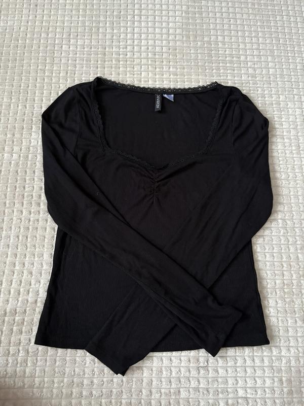 Чорна кофта з довгим рукавом Розмір: L Колір: чорний Матеріал: трикотаж Стиль: довгий рукав, приталений силует Деталі: квадратний виріз з мереживом, збірка на грудях Призначення: casual або вечірній стиль, можна поєднувати з джинсами або спідницею