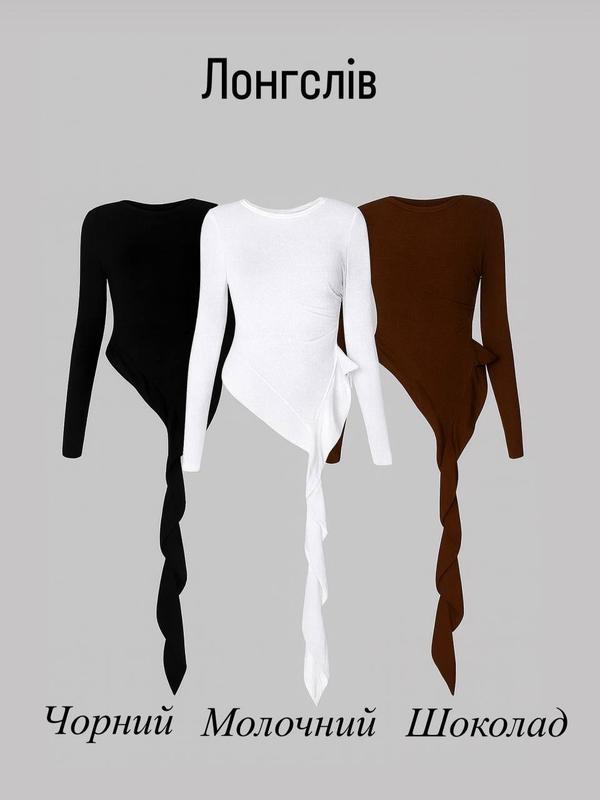 База, яка перетворюється на розкішний максимум🔥 Мод.655 Тканина:мікродайвинг Розмір:42-44 Кольори : молоко, чорний, шоколад Опис: Лонгслів з подовженими асиметричними лініями, що створюють ефект візуальної легкості та витонченого руху. Нестандартний хвилястий низ додає образу динаміки та створює той самий настрій розкішного максимуму,коли одна річ задає тон усьому образу💫