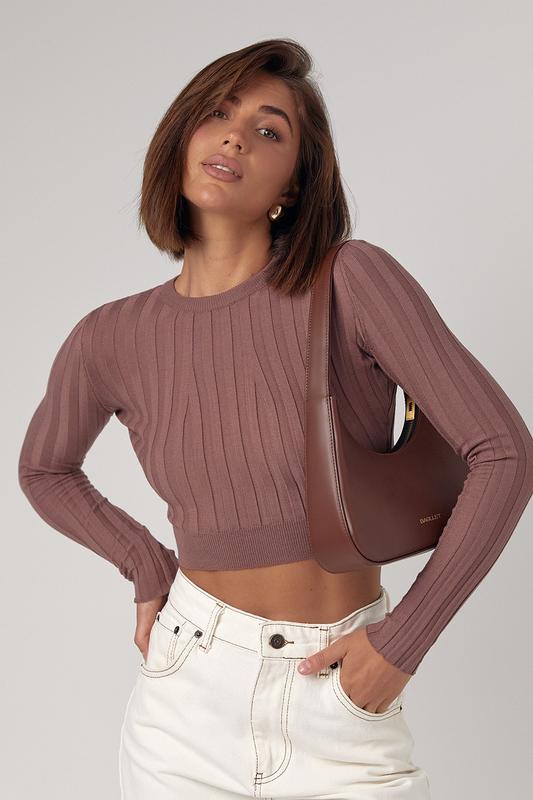 Стильна та комфортна основа для твоїх повсякденних та робочих образів - це модний жіночий лонгслів з трикотажу в широкий рубчик. Завдяки трендовій текстурі тканини, така річ додасть динамічності звичним комбінаціям одягу. В укороченій моделі краї прямого низу маєть широку манжету, яка візуально підкреслює талію. Довгі рукави йдуть без манжети. Кругла горловина обшита бейкою в тон.