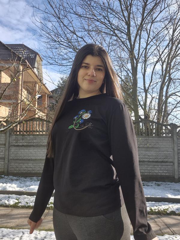 Вышитый женский лонгслив, ткань стрейч кулир, очень приятная к телу, размер М, длина рукава 60 см, длина изделия от плеча 67 см