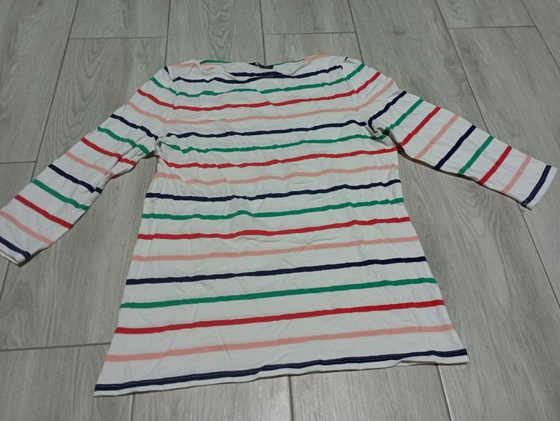 Стильна та практична кофта (лонгслів). Модель має класичний прямий крій та яскравий принт у горизонтальну смужку синього, зеленого, червоного та рожевого кольорів на білому фоні. Склад: - 95% бавовна, 5% еластан. Тканина м'яка, добре дихає та злегка тягнеться завдяки еластану, забезпечуючи ідеальну посадку. Розмір - UK 16 / EUR 44 / CAN/US 12 (йде на український 50-52 або XL)