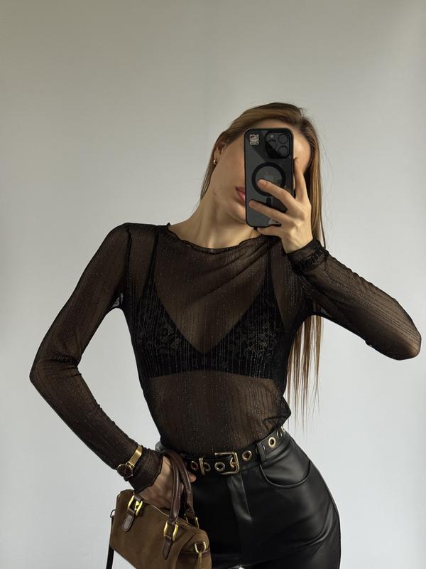 Чорна кофтинка-сітка з люрексовою ниткою Стильно блищить при світлі, виглядає ефектно та дорого. - Розмір: універсальний XS / S / M - Добре тягнеться, комфортно сідає по фігурі - Легка, не парить, ідеальна для свят, вечірок та виходів - Підійде під спідницю, штани або джинси Швидка відправка Пишіть — з радістю підкажу по посадці. Одягнено на параметри: зріст 167см, груди 83см, талія 64см