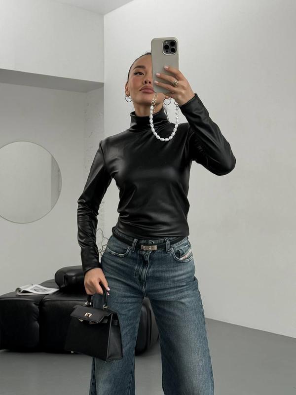 Шкіряний лонг топ з екошкіри з довгим рукавом