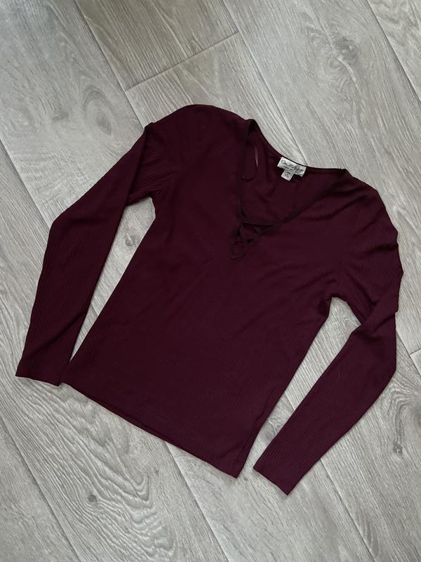 лонгслив у рубчик з вирізом,гарно сідає по фігурі,красивий бордовий колір,розмір С,стан ідеальний,за додатковими питаннями та замірами пишіть)