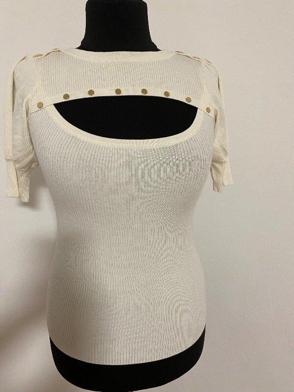 Кофта з віскози 80% і нейлону, колір айворі, розмір С вказано, демонстровано на манекені 52 розміру. Довжина - 57см, плечі - 35см, рукав від плеча - 28см, пог - 36см, пот - 30см, поб - 30см. М'яка і еластична.