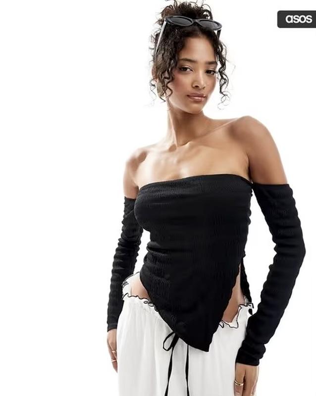 Чорний топ/лонгслів з відкритими плечима і розрізом збоку.Тканина жатка . Заміри: ▪️Рукав-52 см ▪️Довжина - 28/44 см ▪️Груди -39, тягнеться до 50 см