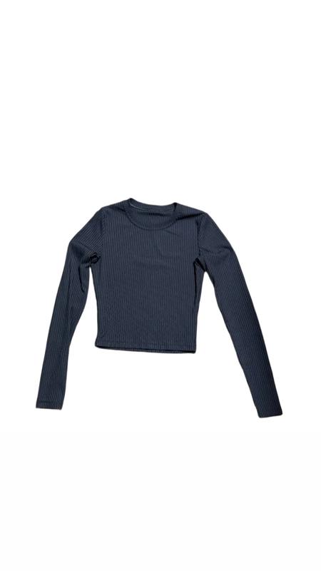 Кроп-лонгслів у рубчик • Розмір: S. • Колір: Графітовий • Тканина: Еластичний трикотаж у вертикальний рубчик. • Фасон: Вкорочена модель (crop), довгі рукави, круглий виріз. • Стан: Відмінний. Базова річ, що ідеально поєднується з високою посадкою шортів чи спідниці.