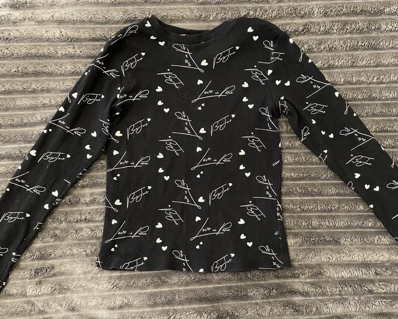 Чорний лонгсів розмір Xs-M (по розміру L) Колір: Чорний. Матеріал: Ребристий трикотаж. Дизайн: Вкритий білим принтом із написами "Love in Paris" (або схожими) та маленькими білими сердечками. Фасон: Приталений (slim fit).