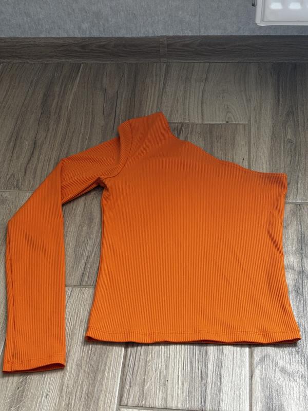 Яскравий оранжевий топ на одне плече Стильний облягаючий топ на одне плече в насиченому оранжевому кольорі 🧡 Тканина в рубчик, добре тягнеться та красиво підкреслює фігуру. Має довгий рукав з одного боку — виглядає дуже ефектно та трендово. ✨ Ідеально підійде для: • вечірніх виходів • фотосесій • святкових подій • стильних повсякденних образів Поєднується з джинсами, спідницею або класичними штанами. Стан: відмінний (без дефектів) Розмір: (М)