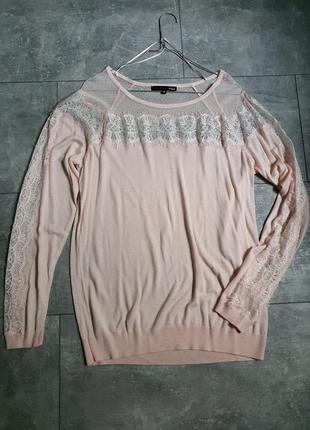 Кофта блідо-рожевого кольору з ажурним мереживом. Заміри: Довжина виробу по спині: 68 см. Довжина рукава від ворота 74 див. горловини 27 див. ПОГ 49 див. внизу 41 див. Гумка. Склад: 40% віскоза, 30% модал, 30% поліамід, мереживо - 100% поліамід. Оплата на карту Приват банк і доставка Новою Поштою.
