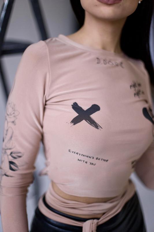 Офігенний кроп топ із зав'язками і довгим рукавом.;}