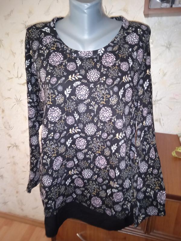Розмір на етикетці 48/50, дивіться виміри. Ідеальний стан, без дефектів. Тканина середньої щільності, добре тягнеться, 100% бавовна. Знизу вставка - шифон. Заміри: довжина від верхньої точки плеча до низу 73. довжина рукава від горловини 69. п/про біцепса 19 тягнеться до 23. п/про грудей 62 тягнеться до 72. п/о талії 61 тягнеться до 71. п/про внизу 65 тягнеться до 71. Х6