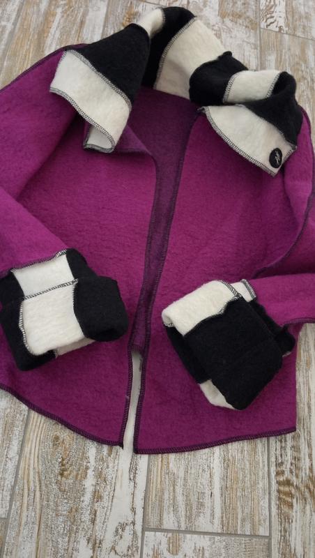 В Україні бренд не представлений. Скандинавський бренд, дизайнерська річ ручної роботи. Неймовірно легка та тепла. Стан ідеальний. Валяна вовна (шерсть) 100%. Кофта без застібок, носиться як накидка - жакет. Горловина -21см, плечі -39см, максимальна довжина рукава -74см але він підворачується під довжину вашої руки. Напівохват пройми -36см, довжина по спині -48см, довжина спереду -57см, ПОГ-57см, ПОТ-46см.
