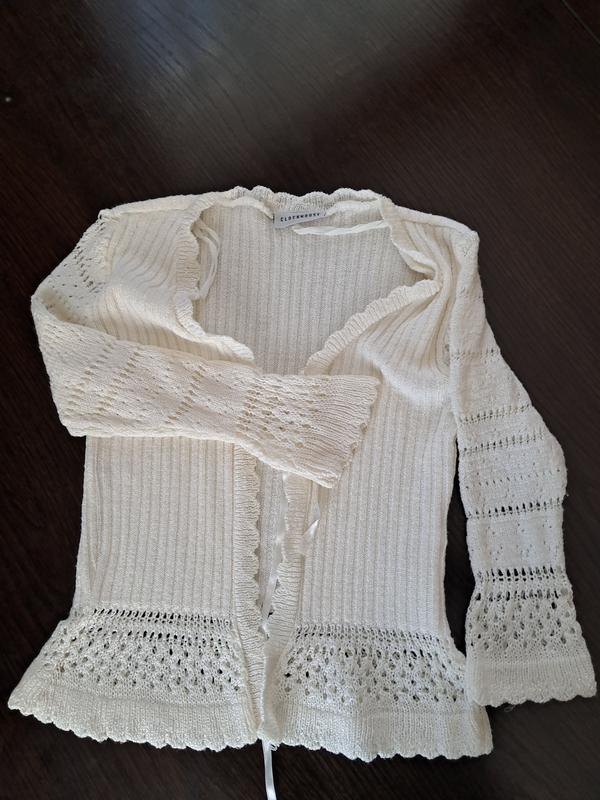 Біла кофтина, ажурна в'язка. параметри: довжина від плеча 59 см. довжина рукава 40. ог 84