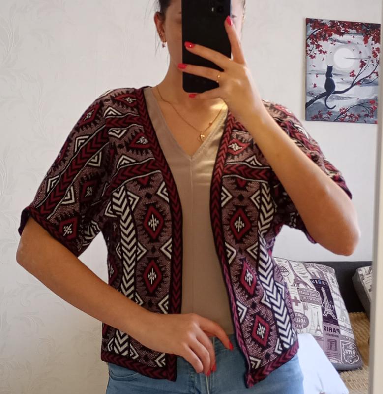 Цікава етно-накидка, без гудзиків, буде чудовим доповненням до урочистих та навіть кежуальних луків. Виглядає стильно та водночас автентично.