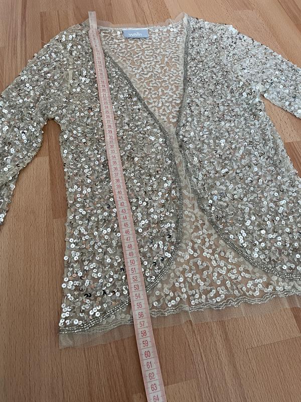 Накидка в паєтках , застібка на малесеньких двох гачках спереду , рукав в три чверті , заміри на фото , підійде від s до м