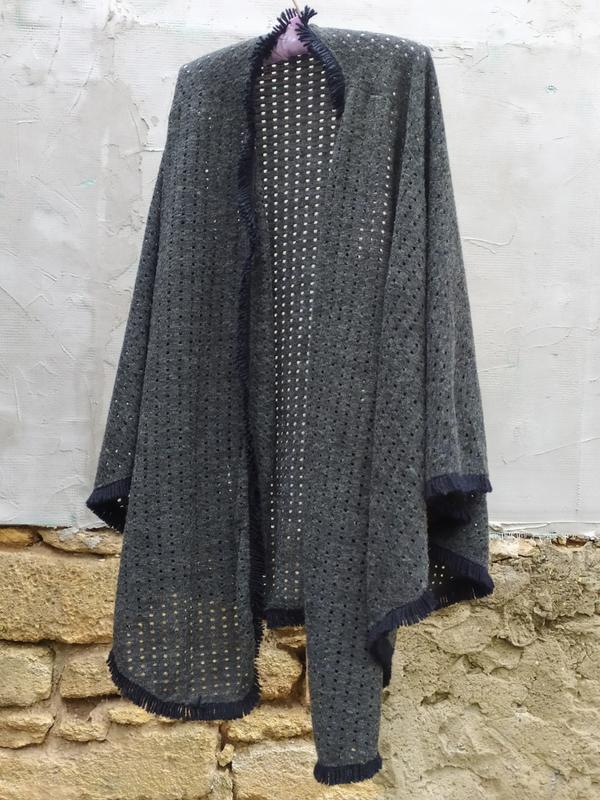из нюансов: оборваны петельки на рукавах и пуговицы не везде. Можно застегивать спереди и рукава. Длина 165 см. общая ширина 100см. рукава 63 см.
