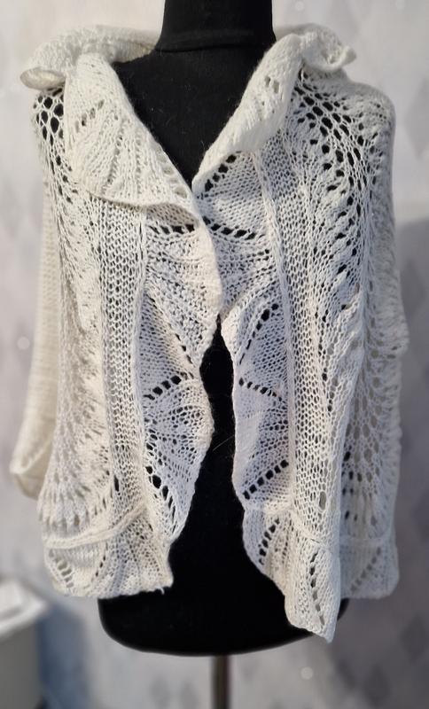 Ручной работы связана на спицах. Нежная и ажурная паутинка, шаль, палантин, накидка. Замеры: Ширина изделия - 145 см Ширина горловини - 46 см Ширина плечей - 68 см Длина изделия - 53 см Длина ворота - 7 см Илеально подходит к платье с открытым верхом, и как шарф.