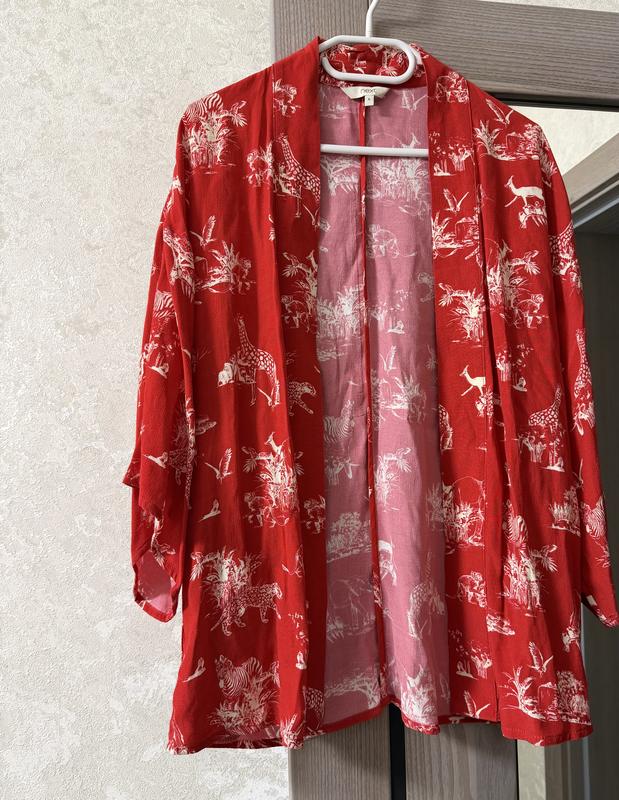 Легкий жіночий кардиган / накидка Next червоного кольору з білим принтом. Вільний крій, без застібок, рукави 3/4. Приємна, тонка тканина - 100% віскоза. Ідеально для літа, пляжу або щоденних образів. Є кишені