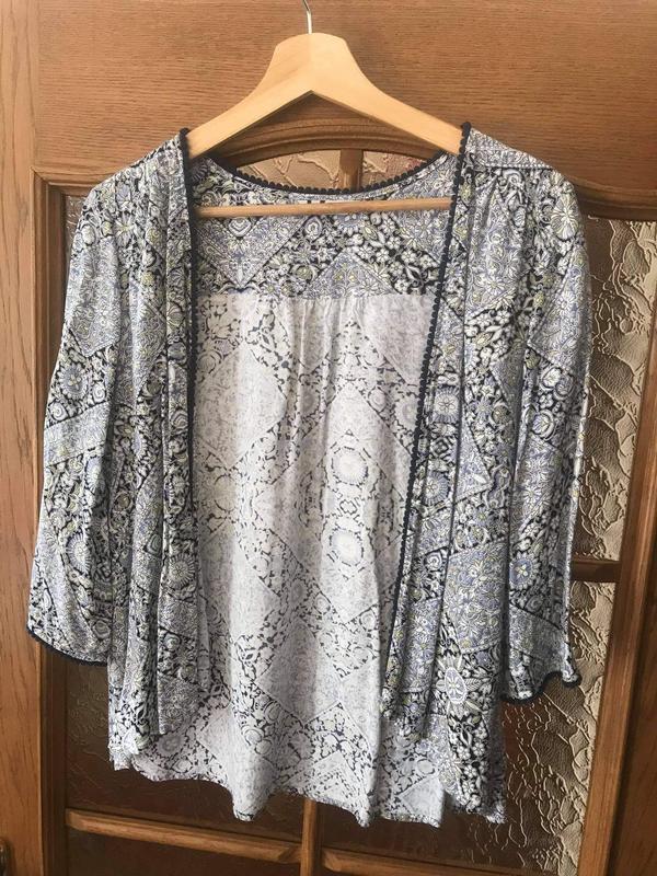 Невагома красива накидка - кардиган. Дуже універсальна річ. Може бути і як до плаття , так і до брюк. Дивиться дорого. Не мнеться. Не секонд. Не одягалася жодного разу. Склад тканини див на фото