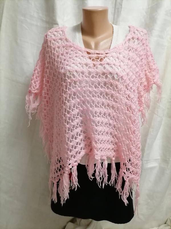 Добрий день Рада вітати Вас на своїй сторінці Всі речі в хорошому стані Hand made Рожеве в'язане пончо, коротеньке, оздоблене бахромою, не кусається Розміри Плече 32 см Довжина 50 см Ширина напівоб'єм 73 см Фото на маленькому жіночому манекені. Купляєте те що на фото без претензій Перед покупкой все хорошо заміряйте, обміну та повернення немає Доставка НП та УП після оплати на картку З 15 квітня по 15 травня буду відсутня