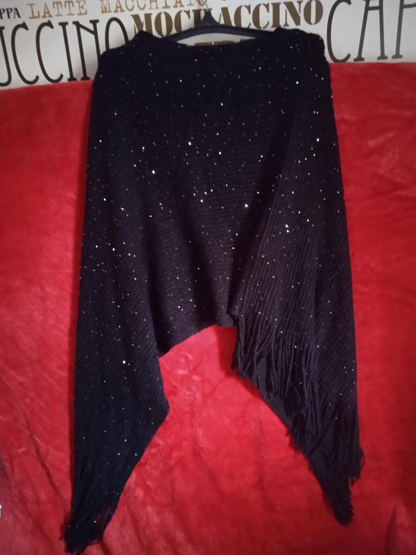 Шикарна тепла накидка -пончо чорного кольору з пайєтками прикрашена бахромою дуже красиво та нарядна реч. Довжина 58 Довжина боків 92