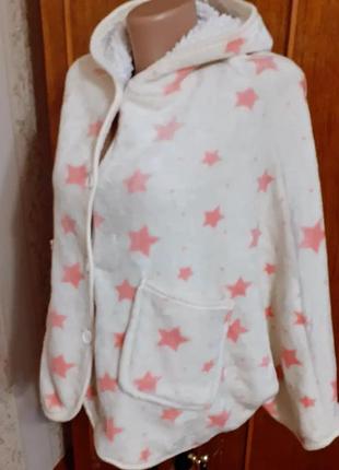 Пончо накидка велюровый с большим теплым ворсом как овчина с карманами на пуговках рукава на кнопках с капишеном ванильного цвета с принтом звездочек!состояния новой вещи👍Ш по низу 120 Дл.64 По ог 110см!
