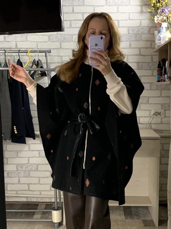 Якісне незвичайне пончо відомого гарного бренду Desigual! Нове, навіть фурнітура в плівці! Поліестер, тобто якісний теплий фліс! Розмір універсальний, довжина 85 см Ширина від отвору до отвору, де затягується пояс 43 см, загальна ширина до країв полотна 92 см - це напівобʼєм