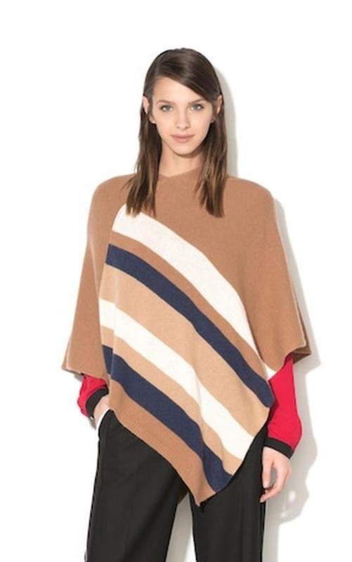 Чудове пончо карамельного кольору з вставкою синьо-білі смужки. Дуже гарний варіант для утеплення в холодну пору року. Розмір one size Склад : 35% поліамід 30% віскоза 30% вовна 5% кашемір Довжина - 70 Плечі 52