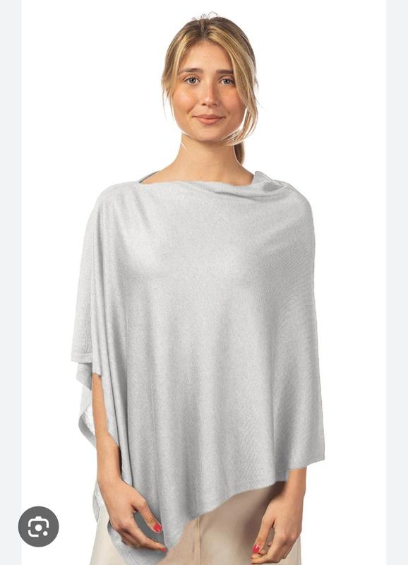 Елегантне пончо Monari світлого димово-сірого або блідо-блакитного кольору. Має вільний, м'який силует і широкий виріз-човник, що гарно драпірується. Виготовлене з тонкого, легкого трикотажу, ідеально підходить для створення стильних багатошарових образів у міжсезоння або для прохолодних літніх вечорів. Довжина — до лінії стегон. Бірка зі складом зрізана . В скаді точно вовна ( перевіртла вогнем), або суміш вовни і кашеміру ( на дотик м'яке і ніжне)
