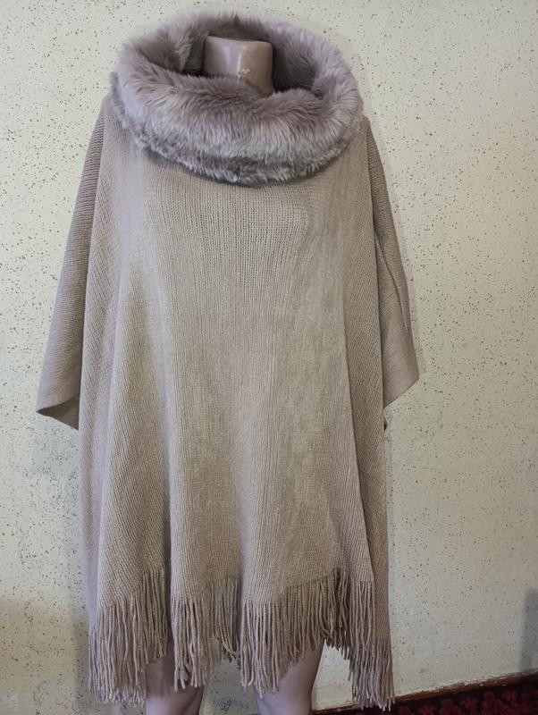 Вязаное пончо меховым воротничком. Зручне,зимове.тепле. Тканина акрил,хутро штучне. Бирки с составом отсутствуют (срезанные) Посмотревшись на аналогичном пончо. Стан - идеальный Ширина по спине и по переду 101 см Длина 68 см