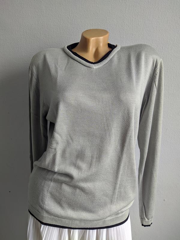 Безпечною оплатою Новою поштою не відправляю, можливо тільки Укрпоштою та Розеткою. Щотижня нові надходження, доступні ціни, підписуйтесь, буду рада бачити Вас у моєму магазинчику! Якісний пуловер з V-вирізом з вовни та акрилу (бірка зі складом зрізана, тому стверджувати на 100% не можу), cвітло-сірого кольору, обробка горловини та краю рукавів чорного кольору, розмір європейський М, стан нової речі, без слідів носіння, якість на дуже високому рівні, підійде для жінок та чоловіків, виміри: довжина - 62 см, плечі - 42 см, ПОГ - 53 см, (тягнеться), ПО по нижньому краю - 40 см, тягнеться до 53 см, довжина рукава - 61 см. ПОВЕРНЕННЯ та ОБМІНУ ТОВАРУ НЕМАЄ!