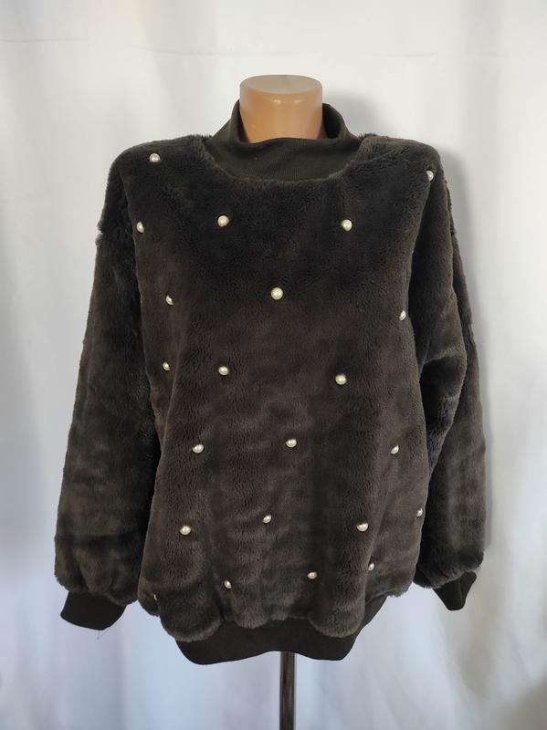 Ідеальні рукави-буфи. Перлини на рукавах та передній частині пуловера. Підкладка: немає. Орієнтовні заміри по готовому виробу: Півобхват грудей - 59 см Довжина рукава від горловини - 69,8 см Довжина виробу по спині - 61,5 см Бирки зі складом тканини немає на виробі.
