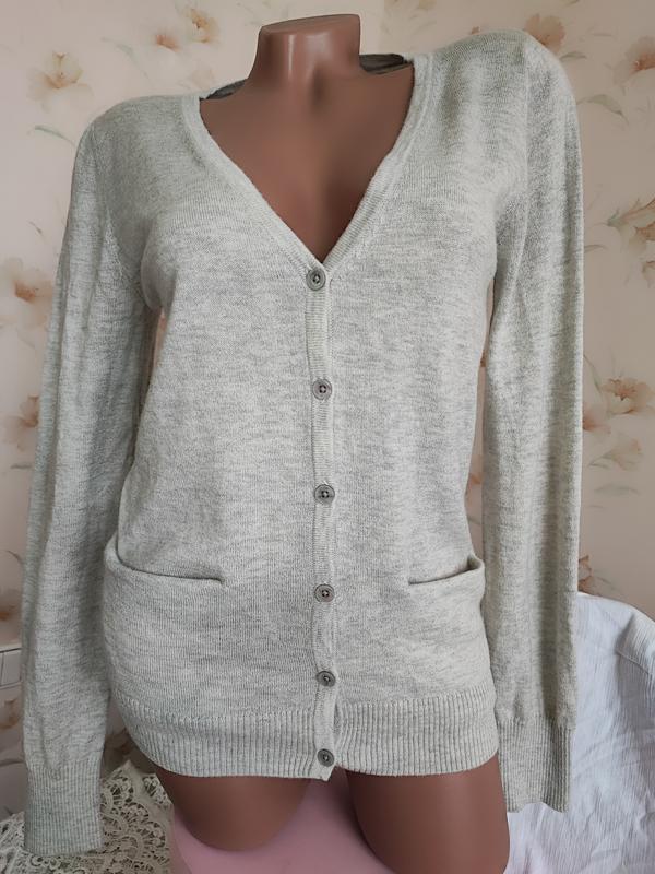 Нежный брендовый пуловер на пуговицах светло-серого цвета. Спереди два небольших кармана. Трикотаж очень мягкий, приятный к телу, не кусается. В составе шерсть, кашемир, нейлон. Не теряет форму и не деформируется при стирке. В плечах 36 см. Длина рукава от плеча 65 см. Состояние идеальное.