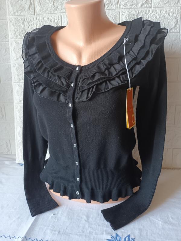 Пуловер, кофта в новому стані, на ґудзиках із кристалів. Склад схожий на котон, еластан. Колір насичений чорний. Заміри - плече 6 см, - довжина рукава 59 см, - довжина по спинці 49 см, - довжина бічного шва 32 см, - напівобхватом по грудях 40 см, - напівобхват на талії 37 см. Кофта тягнеться, замірені в спокійному стані виробу. Відсилання новою поштою та кріплень. Накладеної платежі немає.