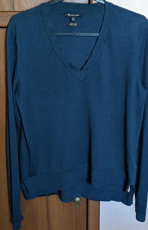 базовий пуловер у розмірі XS, стан ідеал, з прекрасним складом: 43 вовна, 57 шовк малирі, колір пляшковий. ПОГ 48, довжина 55-58, рукав 61, плечі 37. повна лата