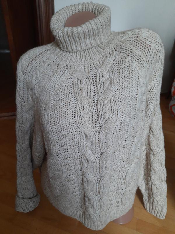 жіночий пуловер, середньої довжини, колір беж, під шию, груба в'язка, довжина 60 см довжина рукава від шиї 77 см ширина 62 см