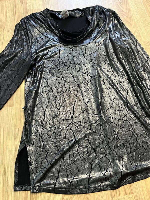 Ефектна жіноча кофта у чорному кольорі з виразним металевим блиском. Має м’який драпірований виріз та подовжений фасон, який красиво сідає по фігурі.
