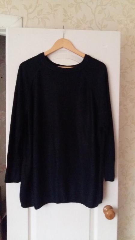 Пуловер оверсайз чорного кольору від французького бренду Jacqueline de Yong, на бірці розмір М, в'язка фактурна. Нюансів немає. Заміри: Довжина 78 см ПОГ 70 см ПОТ 70 см ПОБІДИ 69 см Довжина рукава від горловини 73 см