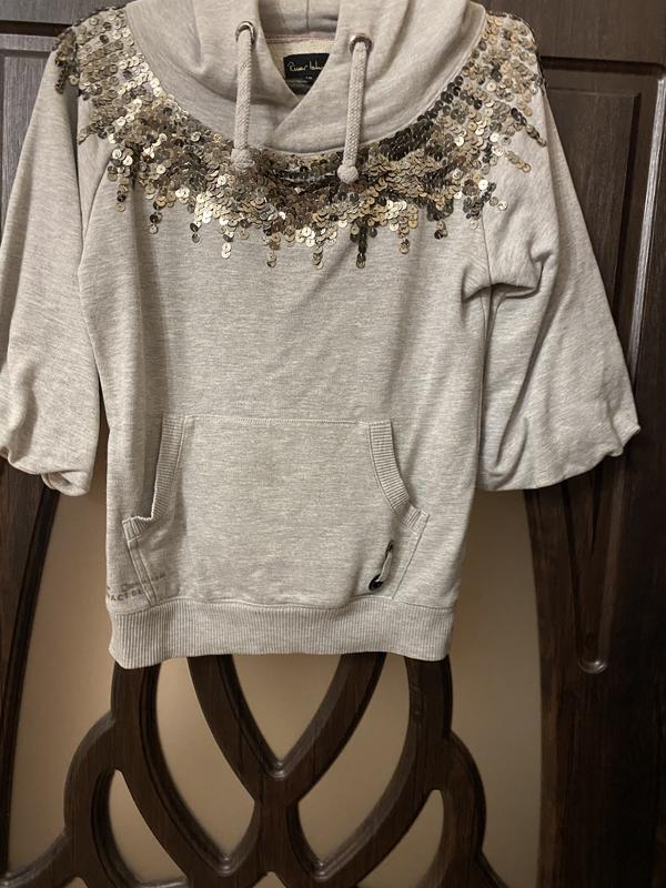 Класна кофточка, з карішончиком, світло сірого кольору. Відмінний, варіант, на осінь, та весну. Гарно виглядає, на фігурі під джинси, чи спортивні штани👌. Брендовоі фірми: Riwer Island. Виробник Турція. Заміри: довжина від плеча до низу 60 см. В полу обхваті в грудях 44 см. на весь обхват 88 см. Талія в полу обхваті 41 см. на весь обхват 82 см. Низ кофточки, в полу обхваті, резинка тянеться до 45 см. на весь обхват 90 см. рукав тричетверті 40 см. Состав: 80% коттон, 20% полістер.