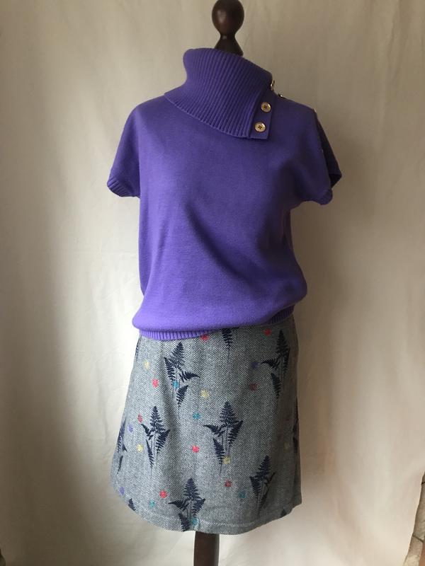 Замеры: в груди - 52, длина по спинке - 60 см. На воротнике и плече по 3 декоративных пуговицы. Цвет фиалковый