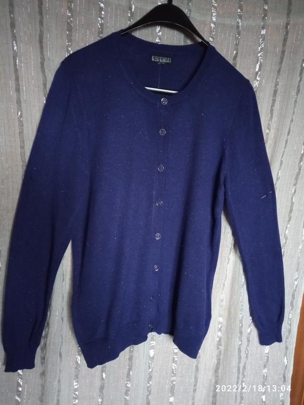 темно синього кольору, переливається покрита інієм не сильно мало,на металевих гудзиках,пог-52см,побіди-52см, довжина рукава-67см,довжина кофти-67см,виглядає красиво, склад тканини віскоза-65, нейлон-35