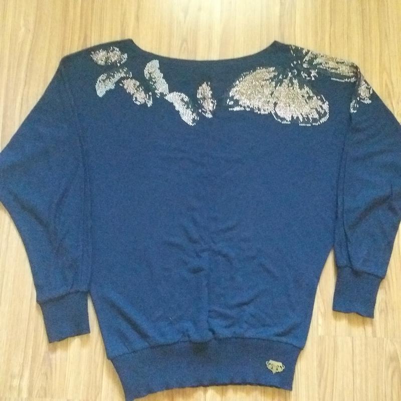 Ошатна тоненька кофта, синього кольору, прикрашена малюнком зі страз. При стірці не відпадають.